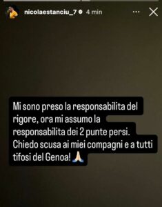 Così Stanciu sul suo profilo Instagram: “Mi sono preso la responsabilità del rigore, ora mi assumo la responsabilità dei due punti persi. Chiedo scusa ai miei compagni e a tutti i tifosi del Genoa“.